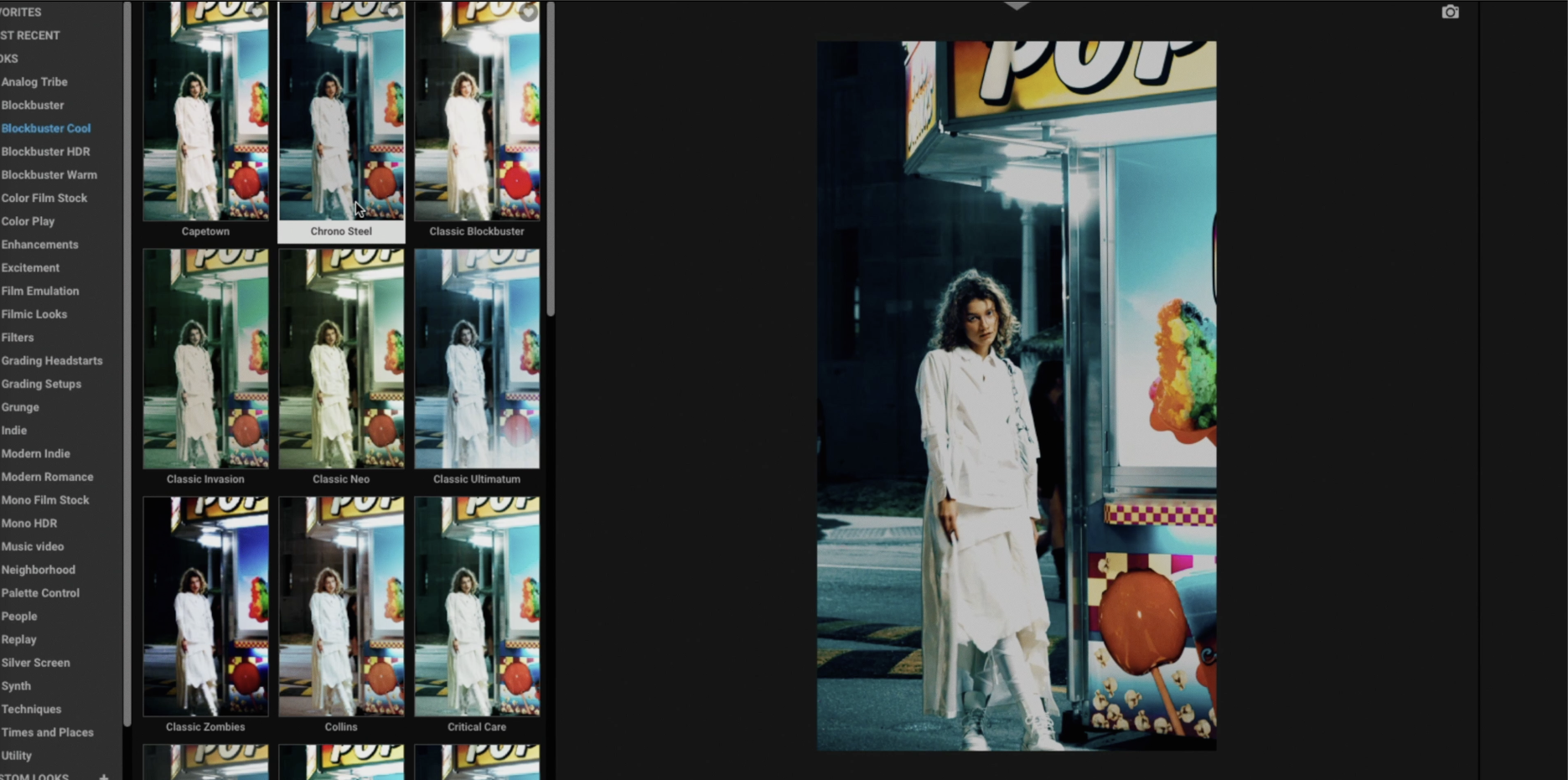 Next, I incorporate Magic Bullet Looks from Maxon One. I often draw from blockbuster-inspired presets across three categories, adjusting the strength to 20-30% or lower to avoid degrading the image. This adds targeted treatments for a refined look.